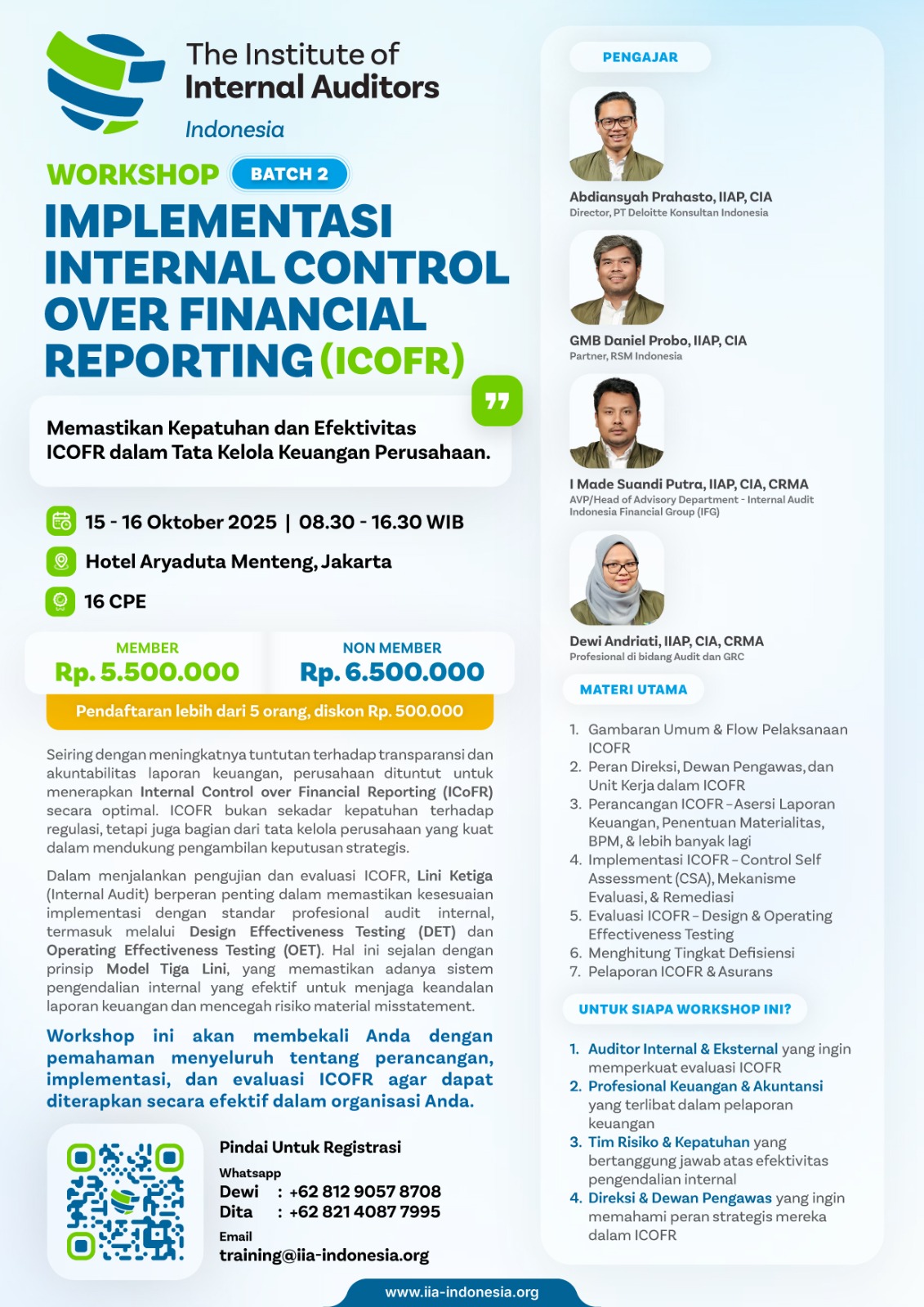 Workshop Implementasi Internal Control Over Financial Reporting (ICOFR) – Batch 2 4 September 20258 September 2025 By Admin IIA-ID D A F T A R