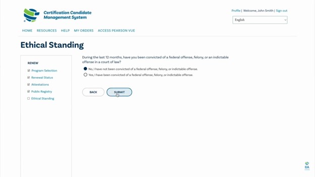 - Berikan pernyataan terkait Ethical Standing dengan memilih jawaban, kemudian klik tombol “Submit” berwarna biru