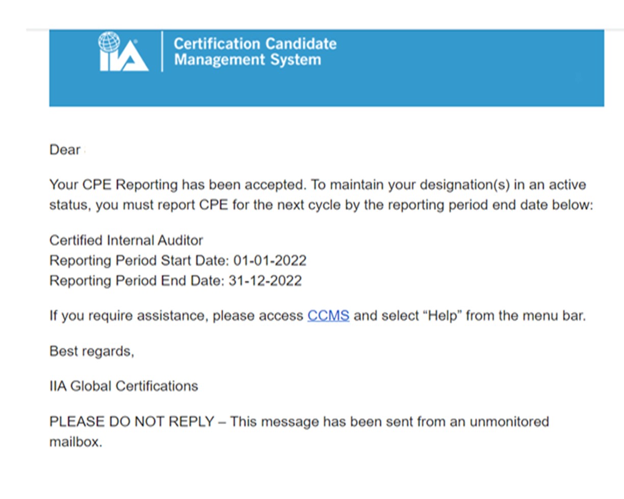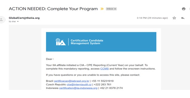 - Setelah mendapatkan notifikasi dari IIA Global, Bapak/Ibu dapat melakukan pelaporan CPE melalui CCMS: