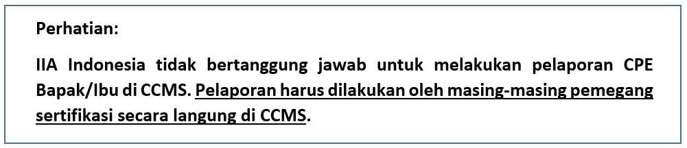 - Pelaporan CPE untuk non-member dilakukan sendiri melalui CCMS. Anggota yang status keanggotaannya tidak aktif pada tahun berjalan diwajibkan untuk melakukan renewal dengan ketentuan mengikuti prosedur dan ketentuan pembaharuan keanggotaan.