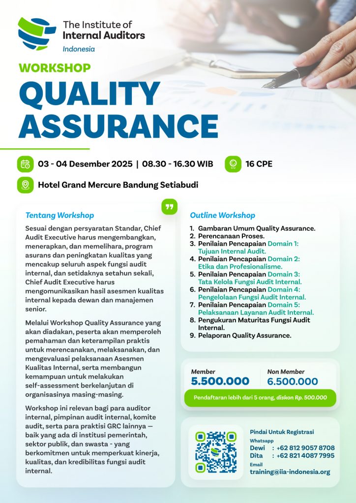 Workshop Quality Assurance, 3-4 Des. 2025 – Bandung 20 October 202530 October 2025 By Admin IIA-ID Unduh Flyer Workshop | Daftar klik disini